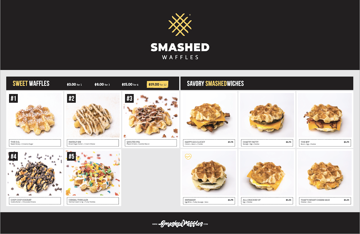 Smashed Waffles offers a delightful variety of unique dishes that cater to both sweet and savory cravings. For those with a sweet tooth, the Sweet Six section is a must-try, featuring the classic O.G. and the decadent Swirly Sin. If you prefer something savory, the Savory Smashedwiches provide satisfying options like the Happy-Go-Lucky and the flavorful Chatty Patty. For an inventive twist, try the Ice Cream Wacos-a fun and indulgent treat with choices like Cookies & Dream and the rich Buttercup. Don’t forget to pair your meal with a refreshing drink from the Coffee selection, including the energizing Morning Mojo and the bold Blackout. To round out your experience, indulge in a Foam Party, with options like the creamy Snow Cream and the indulgent Cookie Monster. Each dish offers a creative, flavorful experience, perfect for any craving.